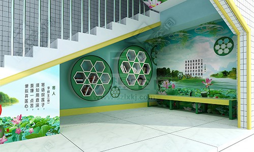 学校楼梯下的小角落由于其形状不规则,空间大小又有限制,往往被看作是无法利用的死角,成为文化空白、堆置杂物的场所。通过联想空间校园文化建设,让楼梯角发挥独特功能,使它意趣盎然、妙趣横生,成为校园中一个新的开放式学习空间。